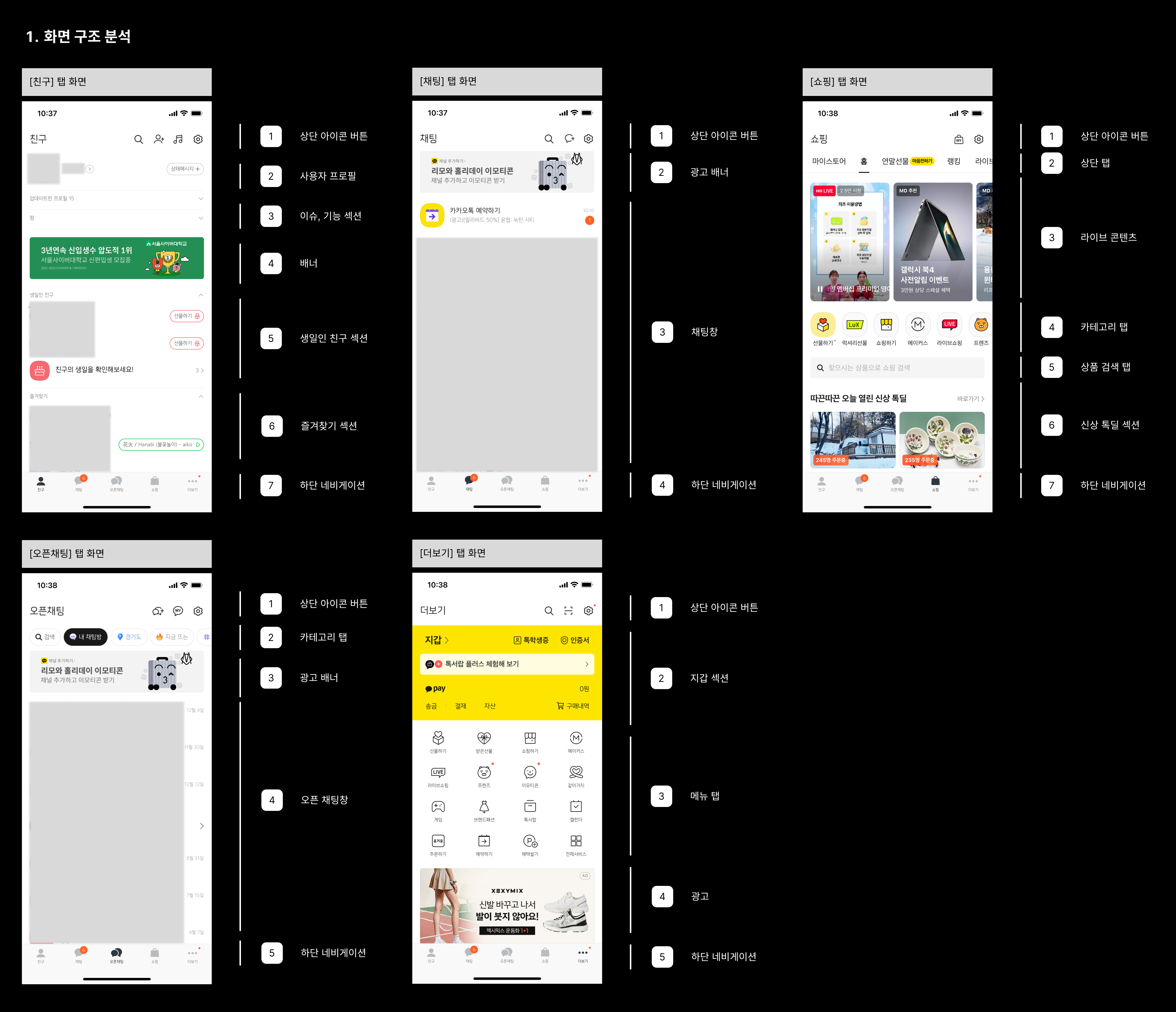 카카오톡에서 5개의 메인 탭 화면이 각각 어떠한 구조로 되어있는지 나눠보세요
