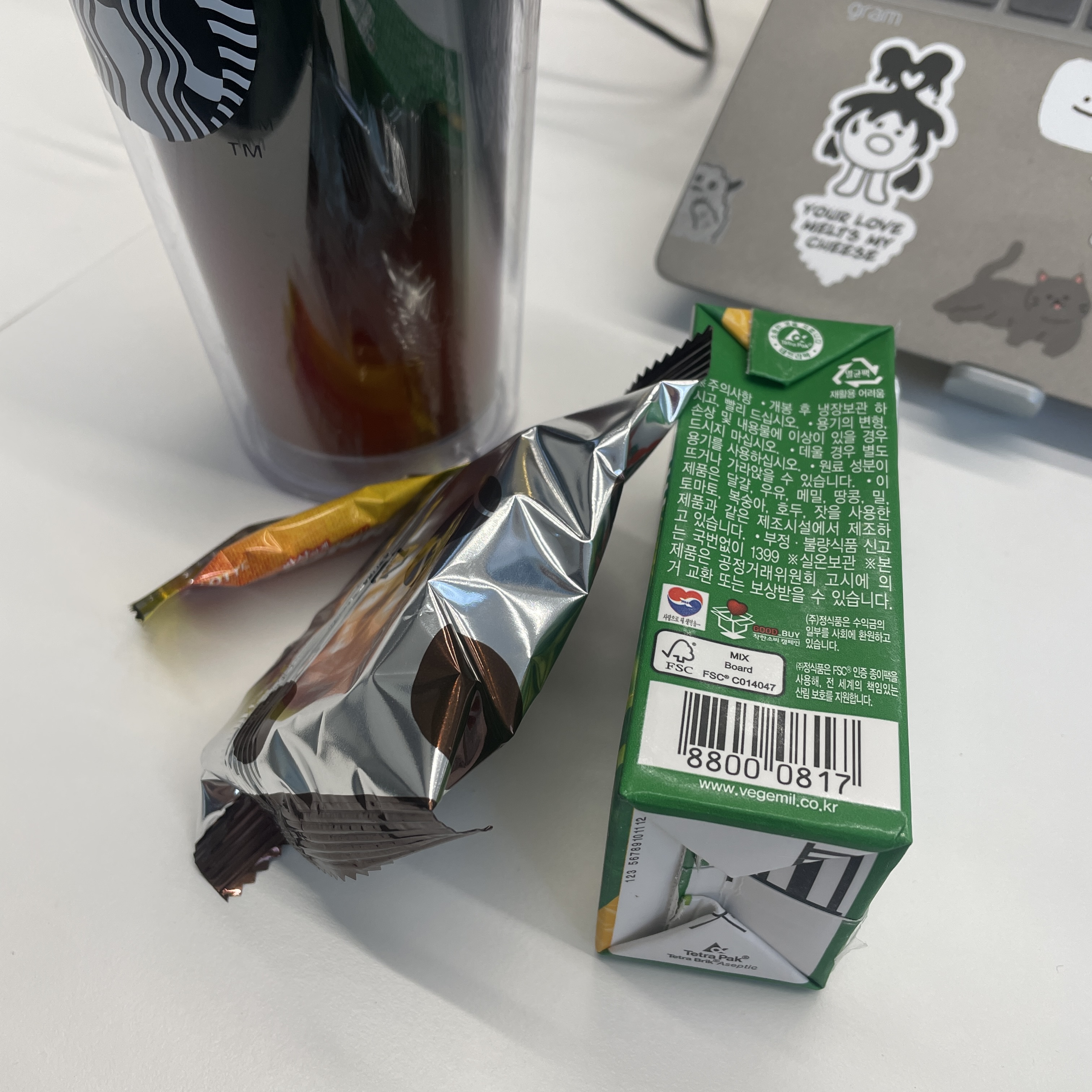 배가 고파서 두유랑 간식들도 업무 시작 전에 야무지게 챙겨 먹었다!